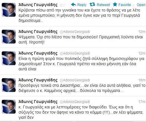 Ο υποψήφιος βουλευτής με τη Νέα Δημοκρατία, σχολίασε για τη σύλληψη μετά τη μήνυση από τη γυναίκα του Πάνου Καμμένου: «Κρύβεται πίσω από την γυναίκα του και έχετε το θράσος να με λέτε εμένα μπουμπούκο; Η μήνυση δεν έγινε καν για το περί Γεωργαλά δημοσίευμα. Είναι η πρώτη φορά που πολιτικός ζητά σύλληψη δημοσιογράφου για δημοσίευμα!».